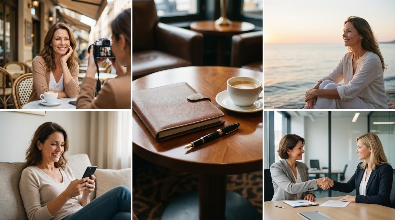 プロに撮ってもらうのが一番ですが、まずは「晴れた日の屋外」で友人に撮ってもらうことから始めましょう。室内光は40代の肌をくすませ、老け見えさせてしまいます。